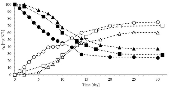 The intersection point of curves in Figure 1, representing the equal molar concentration of nitrite and ammonium during the nitritation, was found to depend on the TOC/N ratio: in particular, in the test with the lower TOC/N ratio (test N1), this intersection point was reached after 10 days, while in tests N2 and N3 the equal molar concentration of ammonium and nitrite was observed after 14 days and 16 days, respectively.