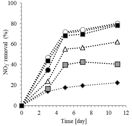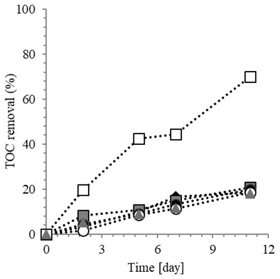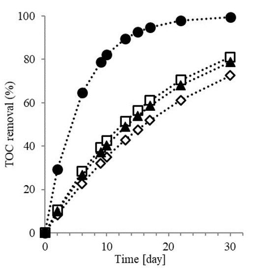 During denitritation, in fact, organic carbon acted as an electron donor and an increase of TOC concentration allowed the nitrite reduction [45]. Nevertheless, a further increase in the organic matter content did not result in a corresponding raise in nitrite removal, and the TOC removal was the prevailing process. Data in Figure 5, where TOC removal along time is reported, shows that similar trends were observed when TOC/N was in the range 0.11–0.75. A final TOC removal of about 20% was calculated in all the tests (after 11 days), while in test with the higher TOC/N ratio, a substantial TOC reduction occurred (about 70%).