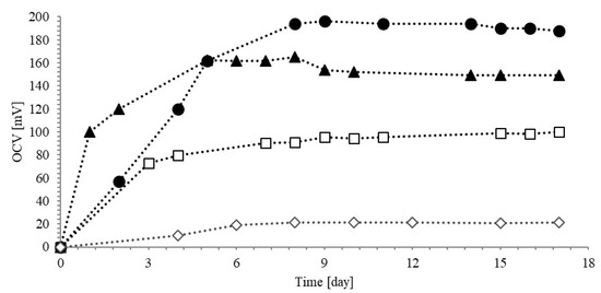 To assess the electrical performances of the MFC, Open Circuit Voltage (OCV) was measured during the experiments. The sulfate ions effect was not evaluated in this study because no change in sulfate concentration was detected: ammonium sulfate was used as the ammonium source, even considering that sulfate can act as an electron shuttle from the cell to the electrode [41].