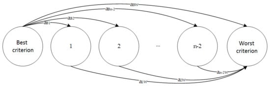 where represents the preference of criterion j over the worst criterion W. The value of will be equal to 1 if criterion j is the worst criterion (. Due to the reciprocal property of the pairwise comparison matrix, totally (2n − 3) pairwise comparisons are conducted by each decision maker.