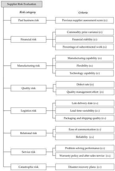 Procurement and purchasing are vital functions that have strategic importance for the success of an organization. Generally, a company spends almost 60% of its total sales on purchasing raw materials, assemblies, components, and parts [1]. Hence, evaluation and selection of suppliers is one of the most critical strategic decisions for developing a competitive and sustainable organization [2]. Nowadays, supplier selection problem incorporates approaches from different disciplines and goes beyond traditional cost minimization and profit maximization objectives [3,4,5]. Especially a growing number of researchers started to incorporate risk minimization objective into this problem [6,7,8,9]. Supplier-related risks are among the most frequently discussed risks in the supply chain (SC) literature [10,11]. Supply risk is an umbrella term that includes the factors affecting the inbound flow of goods or services; e.g., supplier failures, late deliveries, quality problems, financial instability of suppliers, and poor supplier relationship management strategies [10,12]. Supplier-related risks such as disruption of production, customer dissatisfaction, financial losses, loss of sales, damages to corporate image, and bankruptcy may have serious consequences for companies and their entire SC networks [13]. In today’s competitive and risky business environment, it is very important to work with reliable suppliers for the sustainability of business. Therefore, companies have to consider supplier-related risks and threats in their purchasing decisions. Supplier risk measures have to be defined and incorporated into the supplier evaluation and selection process to mitigate supply risk [1,14,15].