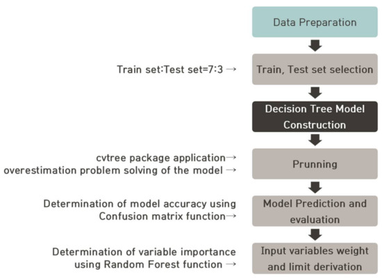 Decision tree analysis is defined as a classification procedure that subdivides a dataset based on a test set defined at each branch or limit value in the tree [40]. This model predicts outputs using given inputs [41] and generates rules for an entire area by repeatedly dividing the area of each variable. Generating rules using decision tree analysis has the advantage of being accessible because of its logical “if–then” format and ease of implementation using simple, structured database languages [42]. The decision tree analysis uses limit values as the criteria for its data classification process.