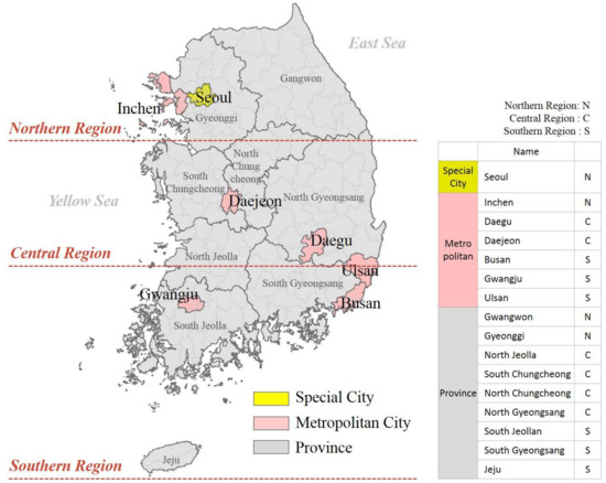 South Korea, a peninsula located in northeast Asia, was used as the case study for this research. The country is connected to the Asian continent in the north and is surrounded by the North Pacific Ocean (see Figure 3). It has an area of 9,972,000 ha as mainland and 3330 islands. It is divided by natural barriers, such as mountains and rivers into three largely distinctive regions: the northern, central, and southern regions. South Korea is divided into 17 administrative districts consisting of one special city, six metropolitan cities, and eight provinces.