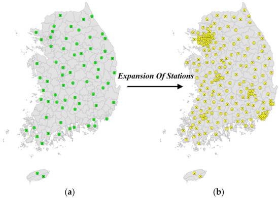 Weather data used in this study came from: (a) automatic weather stations in 73 regions and (b) weather observation stations in 230 regions. (a) data by 73 Automatic weather stations; (b) data by 230 regions.