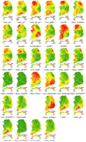 Table 3 lists the weather data indices, and Figure 5 presents the maps of the weather conditions in the study regions from 2005 to 2014. The average values of the precipitation indices “sum_pr” and “max_pr” (see Table 3 for full explanation of the weather index abbreviations) from 2005 to 2014 were 1401.9 mm and 132.4 mm, respectively. High precipitation was observed mainly in the southern and northern regions, in Gyeongnam and Jeonnam Provinces and Seoul and part of Gyeonggi, respectively. The average values for the snowfall indices “max_nsnd” and “sum_nsnd” were 7.7 cm and 28.2 cm, respectively. Precipitation was concentrated mainly in the Jeonnam coastal area and parts of Gangwon Province, which have an average altitude of 500 m above sea level. The average values for the gale indices “max_wind” and “ave_wind567” were 9.9 m/s and 2.0 m/s, respectively. This showed that strong gales were observed mainly in the coastal areas of Jeollanam Province and mountainous areas of Busan and Gangwon Province.
