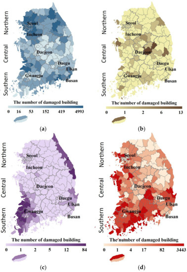 Blong et al. [12] stated that meteorological perils are more significant than geological hazards, noting that the assessment of damage to residential buildings is the most important because they represent more than half of all constructed space. Although land use regulations are strong in some countries, building regulations are rare. The World Bank suggests that building regulations prepared considering national and regional capabilities would be the most effective tools for reducing chronic disaster risks globally [13]. In Korea, regulations for disaster mitigation are present in building laws. However, most of these are related to reducing rain damage, which does not reflect the risk from various natural disasters. Chmutina et al. [14] presented an efficient alternative for creating building regulations aimed at disaster mitigation in Barbados through interviews with public authorities and private experts. To develop and verify building damage assessment methods applicable to earthquake and storm risks around the world, Chandler et al. [15] set the parameters associated with building structures (e.g., age, height, and occupancy) and proposed an evaluation method using vulnerability curves. Various other data, such as the number of floors and construction type, have also been used to evaluate the impact of disasters on buildings [16]. Yazdani et al. [17] collected data on building damage caused by natural disasters based on a field survey and estimated the cause and magnitude of damage based on the structural characteristics of the buildings. Luo et al. [18] analyzed the relationship between gale speed and building damage to reconstruct a gale field around the damage to a residential building after a typhoon. Based on this work, they suggested that such models could possibly be constructed for other disasters. Pita et al. [19] presented a new approach towards assessing hurricane damage to building interiors using the Florida Public Hurricane Loss Model. Finally, Atillah et al. [20] proposed a geographic information system (GIS)-based assessment method to assess building vulnerability and damage in the event of a tsunami in Morocco. Using data on past disasters, they assessed residential buildings and local risks in the Moroccan coastal zone and created a map of building damage.