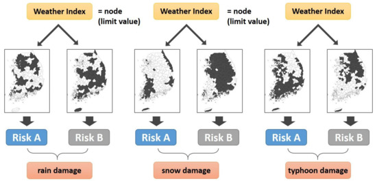 The limit value and weight of the weather factors were derived from the damage caused by each natural disaster scenario using decision tree models R-1, S-1, and T-1, which showed the highest accuracies (see Table 7).