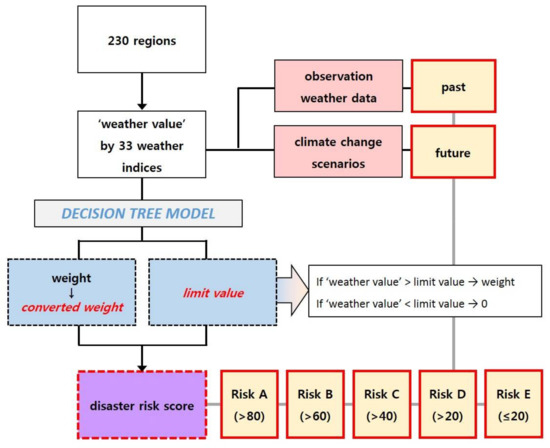 In this study, the weights and limit values of damage to buildings were derived using weather indices based on past weather observation and building damage history to evaluate the risk of damage to buildings from natural disasters. Furthermore, the derived indices were used to predict and analyze risks of damage to buildings in 230 regions in South Korea, based on climate change scenarios. As a data mining technique, decision tree analysis was used to determine the weights and limit values of damage to buildings according to weather indices. A total of 37 indices were used to construct the input model, 33 weather indices were applied as independent variables, and 4 damage history indices were used as dependent variables.