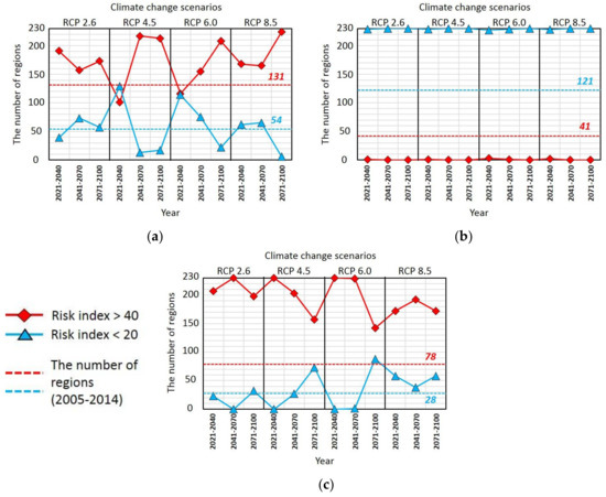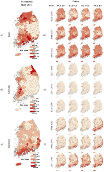 Figure 9 shows the risk of damage to buildings according to each district in Korea. Figure 9a–c shows the past risk of damage to buildings in the 230 regions (2005–2014), and Figure 9d–f shows the future risk predicted according to the climate change scenarios. In total, 131 regions were at risk of rain damage in the past (risk index > 40). These regions were concentrated in the north (e.g., Seoul and Gyeonggi) and south (e.g., parts of Gyeongnam and Jeonnam). In addition, 41 regions concentrated in the coastal areas of Honam, Gangwon, and Hoseo were at risk of damage from snowfall. Finally, 78 regions located mainly in the southern coastal region were at risk of damage from typhoons.