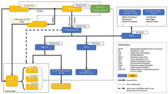 - JDCPhosphate, Inc. Phosphoric Acid Products Made from Phosphate Rock—JDC Phosphate. Available online: http://jdcphosphate.com/phosphates-101/phosphoric-acid-products-made-from-phosphate-rock/ (accessed on 29 March 2018).