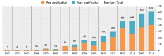 When BEER and G-SEED certifications are obtained simultaneously, incentives are provided, such as reduced property taxes, tax reductions, and increased rates of building volume per lot. Thus, the number of BEER-certified buildings in Korea has increased annually from 2010, as shown in Figure 4. However, calculations as part of the BECC for buildings with BEER certification have indicated that the actual energy consumption of certain buildings might not be in line with predictions [11].
