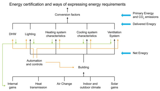 The evaluation method used for the BEER calculation changed after December 2013. Previously, the EP was calculated based upon standard energy use, evaluating the energy savings (%) as shown in Equation (1). Currently, it is evaluated based on primary energy usage (kWh/m2·year). To calculate primary energy usage, the ECO2 program is used, as detailed in Equation (2) and in Figure 5.
