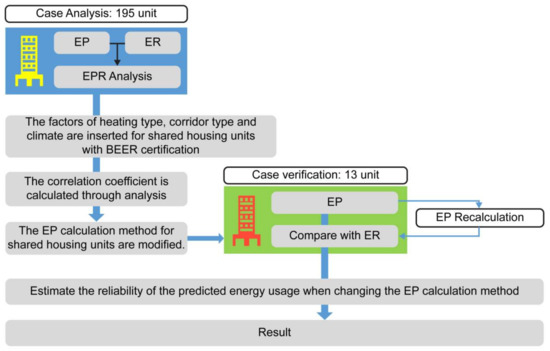 The analysis procedure which we adopted was as follows. Step 1: in order to understand the variable-specific characteristics of the analysis target (195 units), descriptive statistics of the general characteristics (minimum and maximum values, and averages and standard deviations) were determined through basic analysis. Step 2: Differences in the averages between the two corresponding groups of EP and ER were analyzed, followed by difference tests. A p-value (hereafter, referred to as p) calculated by this process with a value <0.05 indicated that the analysis aided by this factor was significant. Step 3: A correlation analysis was conducted to identify the relationships between variables relating to EPR. Step 4: A regression analysis was conducted to identify the influence of the independent variables of Climate, Corridor Type, and Heating Type on the dependent variable EP. Step 5; The estimated EP value was calculated for the test subjects (13 units) using the estimated regression equation, which was followed by difference tests using the t-test for EPR.