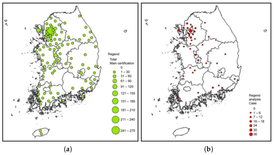 Distributions of all and analyzed units. (a) Distribution of all units; (b) Distribution of 195 analyzed units.