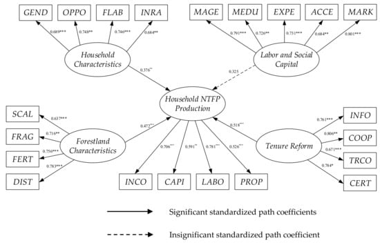 The dataset of our study was reasonably fit for path modelling. While traditional approaches normally first construct summated variables of the latent variables and next estimate the sub-model paths [58], SEM enables simultaneously estimating the direct effects of independent latent variables on household NTFP production, and also the contributions of observed variables on each latent variable [59,60]. Furthermore, both the reliability and validity of the observed variables can be measured by model specification tests, which is important in the present context. In general, because SEM is a hybrid estimation approach, it enables the advancement of our understanding of the relationship between the latent variables through the combination of theoretical hypotheses in Section 2 and empirical knowledge [58].