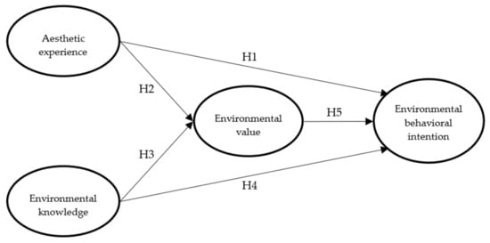 Several empirical studies have reported that aesthetic experience has a direct influence on environmental behavioral intention. For example, assessments of the beauty of a species directly influence the degree of support for the conservation of large mammals in Africa (e.g., zebra, buffalo, hyena, and elephant) []. Additionally, regarding the indirect influence of aesthetic experience on behavioral intention through environmental value, some empirical studies in Germany have indicated that enhancing individuals’ experiences of the natural environment (e.g., aesthetic experiences of plants and animals) is conducive to the establishment of their environmental values, which can then enhance their willingness to protect the environment (e.g., []). A study conducted in Australia also confirmed that emotional aesthetic experiences of nature can influence individuals’ values and beliefs, which can further influence their intention of environmental protection behavior [].