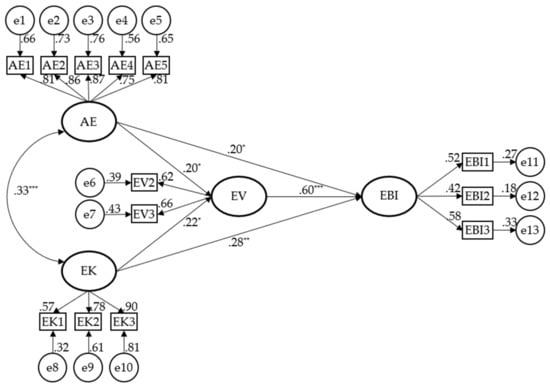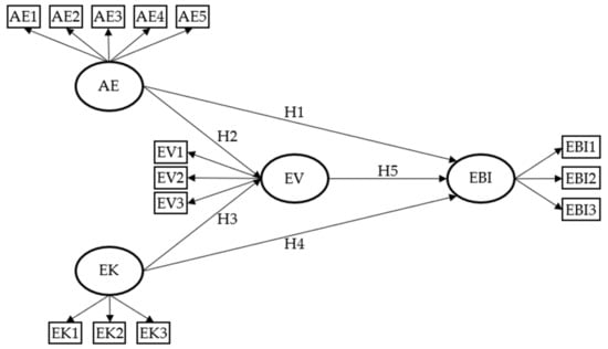 Development of observed indicators for latent constructs in the hypothesized model. Note: Refer to Table 1 for the details of latent constructs (AE, EK, EV, EVI) and observed indicators (AE1–AE5; EK1–EK3; EV1–EV3; EBI1–EBI3).