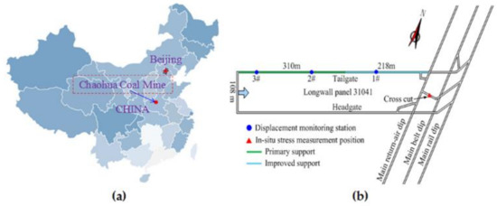 Chao’hua coal mine is located in Zhengzhou City, Henan Province, China (Figure 1a). The depth of the longwall panel 31001 varies between 800 and 850 m. The layout of roadways is shown in Figure 1b. The surrounding rocks of the tailgate are mainly composed of coal seam and mudstone, and the detailed stratum column is described in Figure 2.