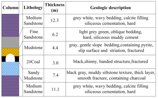 In situ stress measurement, intact rock properties measurement and optical televiewer imaging had been implemented in the in situ tests. The in situ testing borehole was vertical and located in the main dip close to the longwall panel 31041 (Figure 1b), which was 15 m in length and 50 mm in diameter. The in situ stress was measured using the stress relief method [21] and the results were σH = 20 MPa, σh = 18.27 MPa, and σv = 32.15 MPa. The direction of σH was N 122° E. For rock strength measurement, laboratory tests with the ISRM recommended standard [22] were established on different types of rock samples obtained from the surrounding rock masses of the tailgate. The uniaxial compressive strength and Young’s modulus rock samples were obtained from uniaxial compression tests in the laboratory. The intact rock properties are listed in Table 1.