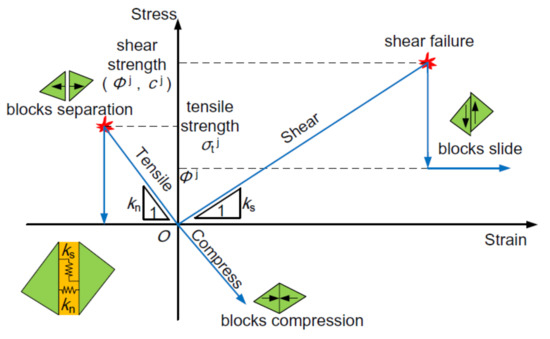 The spring-rider was adopted to simulate the behavior of a contact. In the normal direction of a contact, the relation of stress–displacement is linear and governed by the normal stiffness (Kn) and limited by the tensile strength: