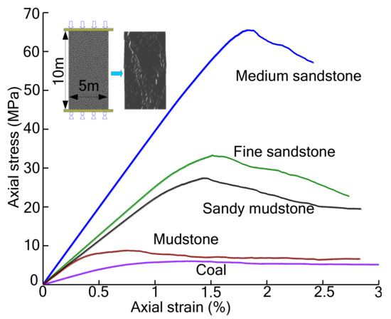 Simulated uniaxial compression stress–strain curves for the rock mass.