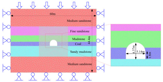 The numerical model of the tailgate model is shown in Figure 7, which is consistent with the lithology of the tailgate illustrated in Figure 2. The dimensions of the model were 60 m in width and 44.4 m in height, which were made up of 13,324 blocks. To enhance the computational efficiency, trigon blocks with edge length of 0.3 m were only generated around the tailgate; the remainder of the numerical model is divided into Voronoi blocks with a graded increasing edge length from 0.6 m to 1.2 m. Constant vertical stress and horizontal stress measured in the field were applied to the upper and lateral boundaries of the model to simulate in situ stress. The bottom and lateral boundaries were constrained. The model was first run to the initial stress equilibrium and then the blocks within the roadway profile were deleted to simulate the excavation.