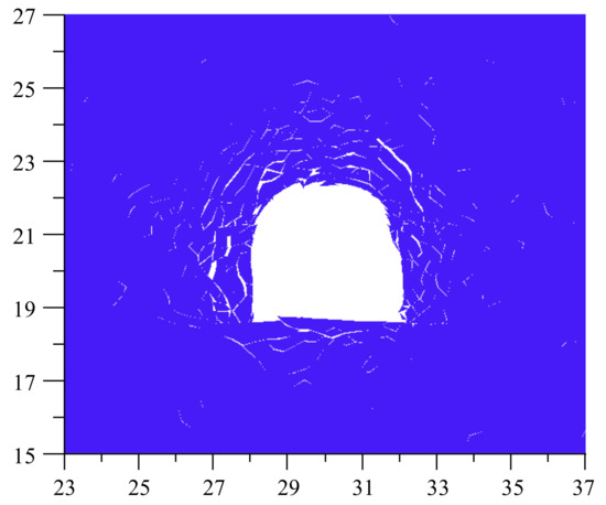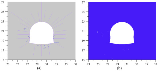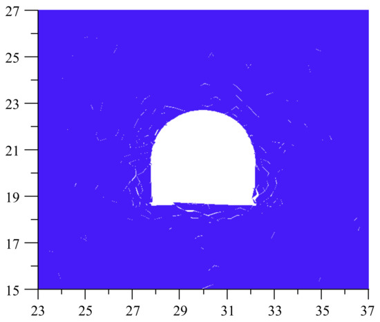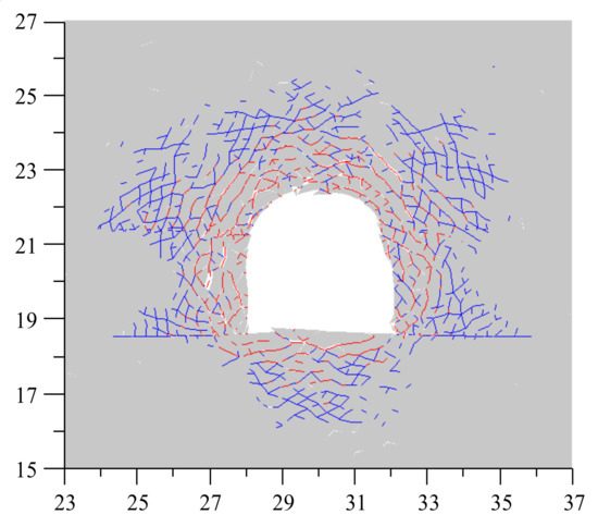 Under no-support conditions, heavy cracks developed and a large crack zone formed around the roadway. Shear cracks were mainly generated in the relatively deep surrounding rock while tensile cracks were mainly generated in the shallow surrounding rock (see Figure 8). These tensile cracks caused rock mass to be greatly fragmented and dilation with a large gap between adjacent blocks [28], which led to clear coalesced macroscopic fractures (Figure 9) and significant roadway convergence (Figure 10). Serious roof subsidence, floor heave and side shrinkage failures then appeared, which was consistent with the large deformation failures observed in the field. The generation and propagation of tensile cracks were closely related to localized tensile stresses [29]. A tension crack is formed when the normal stress applied on a contact exceeds its tensile strength. A large tensile stress zone generated around the roadway (Figure 11), which caused the generation of heavy tension cracks. A large stress relaxation zone was generated around the roadway (Figure 12). This was due to the deviator stress caused by excavation exceeding the peak strength of shallow surrounding rock and causing the failing rock to enter the post-failure zone. Then, the stress concentration zone caused by deviator stress propagated further into the deep surrounding rock. It is interesting to find that the tensile stress zone has a similar range with the stress relaxation zone and loosen zone. Under primary support conditions, it is apparent that the installation of the “ U-shaped steel sets + shotcrete” system obviously constrained the generation of the stress concentration zone and tensile stresses (Figure 13); these notably inhibited the post-failure zone (Figure 14) and crack propagation in the roof and ribs where the support system was installed (Figure 15). The depths of the crack zone in the roof and ribs were approximately 2.7 m and 2.3 m, respectively, compared to 3.8 m and 3.3 m with no support. The number of shear cracks was 494, compared to 759 with no support. The depth and extent of the tensile crack zone were also obviously reduced, the number of tension cracks decreased from 461 to 178, leading to a significant decrease in rock mass fragmentation (Figure 16) and roadway contraction (see Figure 17). However, it seems that the initial support did not really stabilize the roadway. For example, the roadway surface with the primary support still exhibited large stress concentration zone and large tensile stresses. The stress concentration and tensile stresses resulted in large post-failure zone and a large amount of tensile failures, and stress relaxation and tensile failures in the floor are still serious. Consequently, fragmentation and large deformation failure still occurred in these areas, which was consistent with the supported areas observed in the field (see Figure 4), so the primary support should have been improved.