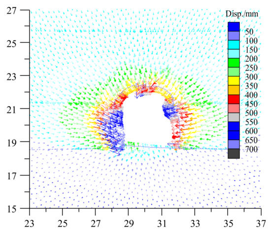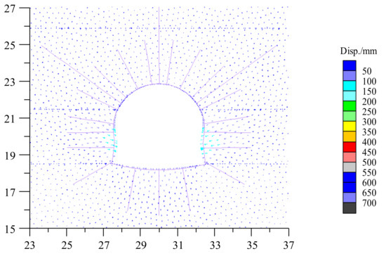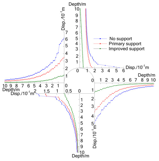 The displacement vector of the tailgate with an improved support structure (Figure 21) indicated that deformation degree and range was significantly reduced, and the deformation distribution tended to be uniform with no evident dilation. The displacement data at different depths of roof, sides and floor under different support conditions were extracted and made into curves (Figure 22). The violent variation of the displacement caused by the fragmented and dilation of surrounding rock disappeared. The convergences in the roof, sides and floor under improved support were 50 mm, 219 mm and 68 mm, respectively. Compared to the 173 mm, 699 mm, and 170 mm with the primary support, the reduction rates were 71%, 69%, and 60%, respectively, and the floor heave has been decreased significantly.