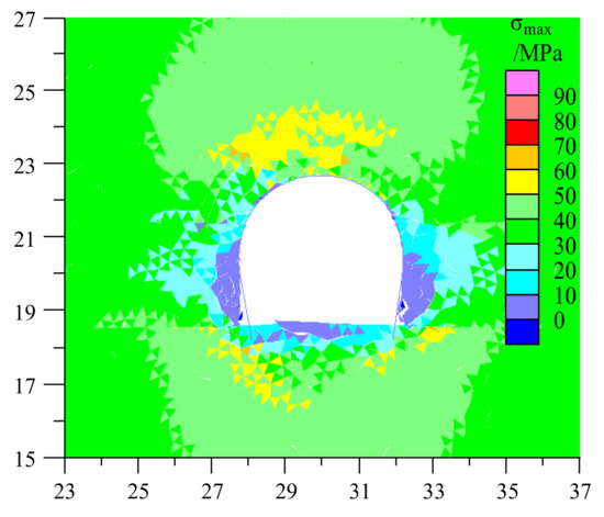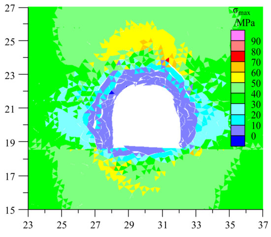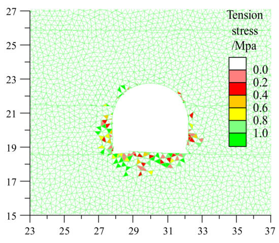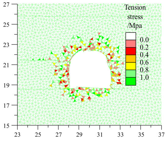 The improved support scheme was successful at suppressing the development of cracks, as can be seen in Figure 19a. Only slight shear cracks developed in the sides and floor and tensile cracking barely propagated. Consequently, there was no noticeable dilation or fractures in the surrounding rock (Figure 19b). Meanwhile, the improved support scheme effectively improved the stress state around the roadway, the stress concentration zone (Figure 20a) and the tensile stresses (Figure 20b) were significantly reduced, especially in the floor.