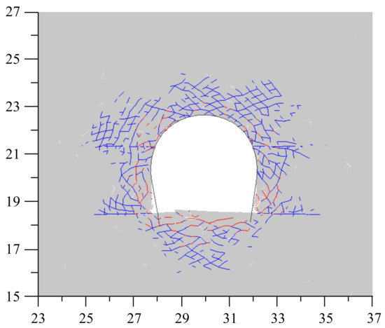 Simulated crack modes of the roadway under primary support type. Tensile and shear cracks are marked by red and blue, respectively. S/T indicates the number of shear cracks number and tensile cracks. S/T = 494/178.