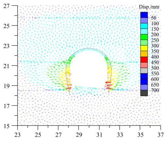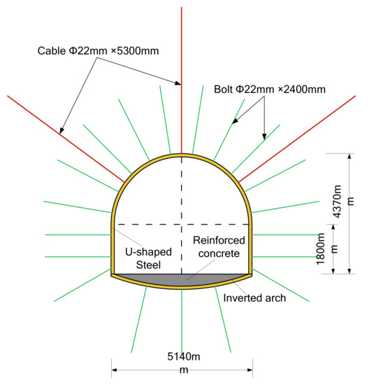 An improved support scheme is proposed as follows: The straight wall and semicircular arch cross section was first excavated with width and height of 5.14 m and 4.37 m. The “bolt-cable-mesh” support structure was installed subsequently. Then, the inverted arch floor was excavated, followed by installation of U-shaped steel sets and floor bolts. Finally, the reinforced concrete was poured in the floor.