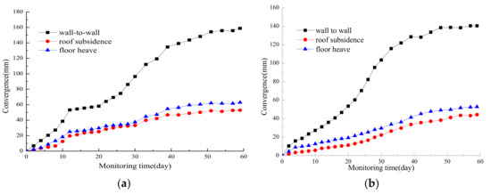 Monitored convergence of the 31041 tailgate during excavation. (a) Monitoring Station #2; (b) Monitoring Station #3.