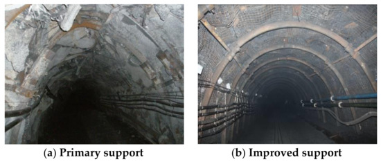 Previous research has shown that the enhancing of confining pressure can significantly increase the residual strength of surrounding rock and greatly restrain crack propagation [30]. The active flexible support system consisted of whole section bolts, cables, load-bearing plate, ladder beam and wire mesh should be installed in time with sufficient pre-stress to seal, compress and reinforce the shallow rock, which can improve the confining pressure and clamp loose surrounding rocks into integrated stratums [16,17,18].The inverted arch floor was constructed to eliminate the poor force state of the right angle and enhance the bearing capacity of the floor. Full-section rigid U-shaped steel sets were installed to form an enclosed high-strength bearing structure which can resist the large deformation due to excavation.