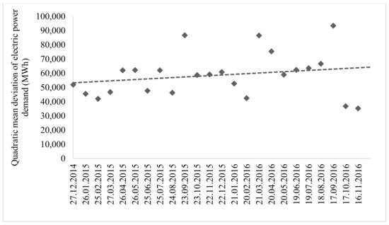 Changes in the structure of power demand and the increasing number of household consumers have resulted in the increased irregularity and unpredictability of electric and heat power demand. Our statistical analysis of the Russian national power system power consumption data during the day-time revealed positive dynamics that reflect a growing deviation of the electric power demand from the mean value (see Figure 2). It appears that the power consumption irregularity growth rate in the power system during 2014–2016 was over 2.4%.