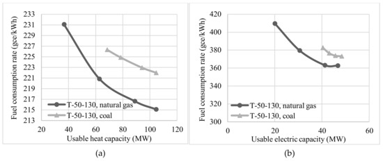 The dependencies of the fuel consumption rates on the heat (a) and the electric (b) loads of T-50-130 co-generating units. Source: our own results are based on References [11,12,13].