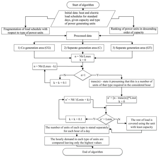 The algorithm shown in Figure 8 presents a combinatorial problem solution that employed the dynamic programming principles based on a stepwise optimisation and successive approximation to the best sample of power generating equipment with respect to the installed capacity ratio. Here, n is the size of the sample of units of a given type, Nh is the load in a particular hour of a typical day, Lmax is a unit of the given type with the maximum capacity, Lmin is a unit of the given type with the minimum capacity, Linst is the installed capacity of the unit of a given type, and finally, n’ is the number of loaded units of the selected type and capacity.