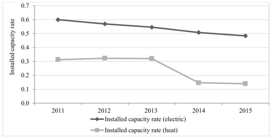 According to its annual reports, the installed capacity rate of the thermal power plants supervised by Mosenergo, JSC has been sustainably decreasing since 2011 to 2015 and its value in 2015 constituted 0.48 (compared to the 0.6 in 2011) for electric load and 0.14 (compared to the 0.31 in 2011) for heat load (see Figure 9).