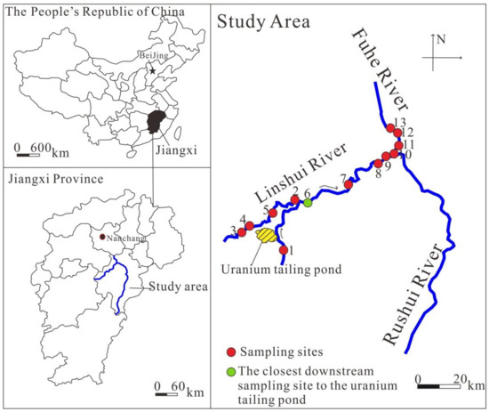 With a length of 165 km across four towns and a catchment area of 5151 km2, Linshui River is an important tributary of Fuhe River in Jiangxi Province. A uranium mining plant, located in the upstream of the river, has been in use for more than 60 years. The operation of uranium mining produces wastewater, abandoned rocks, and residues. These contaminants are carried to Linshui River by rainwater, streams, and soil migration, leading to heavy metal pollution to the river water.