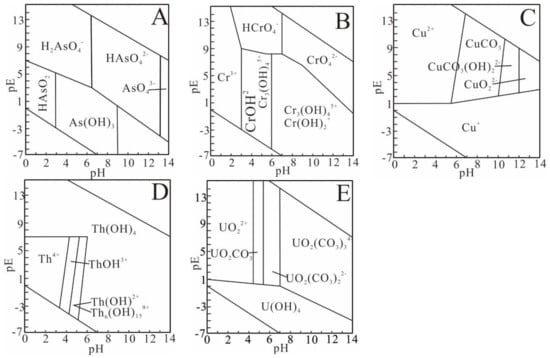 Figure 2. The speciation of heavy metals under different pE—pH conditions in site 6, which is the closest downstream sampling site to the uranium tailing pond. (A) The speciation of As; (B) The speciation of Cr; (C) The speciation of Cu; (D) The speciation of Th; (E) The speciation of U.