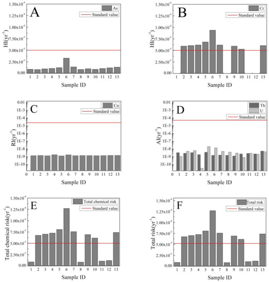 Figure 3. Health risk values of different heavy metals and radionuclides. (A) The HI value of As; (B) The HI value of Cr; (C) The HI value of Cu; (D) The HI value of U and Th; (E) The value of total chemical risk; (F) The value of total risk.