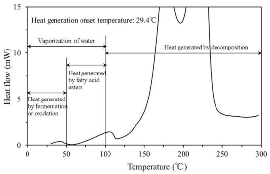 - The results of the C80 measurements showed that the process of heat generation that can lead to the spontaneous ignition of agricultural waste begins with a small amount of heat generated from fermentation or oxidation. Next, the fatty acid esters contained within the materials begin to oxidise as the temperature gradually rises; even if the microorganisms causing fermentation die, the temperature of the material continues to rise which ultimately results in spontaneous ignition.