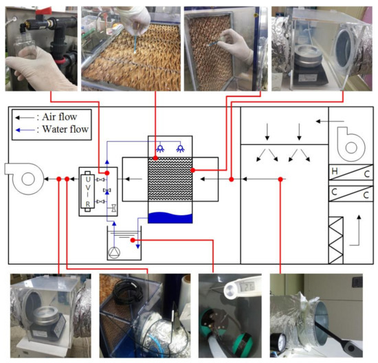 Several studies focused on efforts to prevent contamination of DEC outlet air. Kang and Kato [18] experimented with microwave disinfection of elements in an evaporative humidifier (EH) by using Legionella’s germicidal effect temperature characteristics (it is difficult for Legionella to survive at temperatures exceeding 60 °C). The EH pad was heated to 60 °C for 12 min without a blower and water spray. However, the results confirmed that temperature distribution was irregular, irrespective of wetness, and was not suitable for disinfecting an EH pad. Sung et al. [19] experimented with UV lamps and a water filter to suppress microbial growth of EH. The results confirmed that the microorganisms on the surface of the element, microorganisms inside the air handling unit (AHU), and pollutants in the recirculating water were significantly reduced when an ultraviolet sterilizer was used, although the internal microorganisms of the element were not removed. It is also difficult to disinfect an EH pad surface by using a UV lamp or a microwave. Additionally, degradation may occur after a certain period of time and cause defects in the equipment.