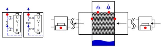 Sung et al. [19] proposed a germicidal system, installing a UV lamp upstream and downstream of the evaporative humidifier (EH) pad and applying a UV water filter to the circulating water. When the proposed germicidal system was used, the bacteria and fungi decreased significantly on the EH pad surface. Microbial contamination of the circulating water was also reduced. In the case of airborne microbes in the air handling unit, it was confirmed that the bacteria decreased significantly, but the fungi maintained a constant degree of contamination. In a study by Sung et al., microbial contamination of outlet air was not measured. However, the proposed germicidal system improved the air quality of the outlet air when contamination of the outlet air was deduced from the pollution degree of the suspended microorganisms measured in the AHU.