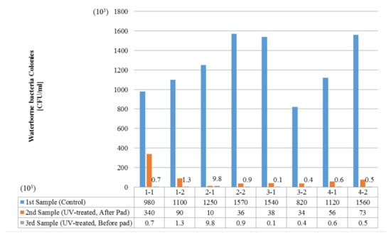 A sample cock was installed to sample the water supplied to the DEC. The sample cock was sterilized with alcohol to prevent cross-contamination during water sampling. The sample cock was opened, 1 L of water was drained, and water was sampled from the sample bottle. In UV-treated cases, the water treated by the UV reactor and the bypassed water were separately sampled by using the valve control.