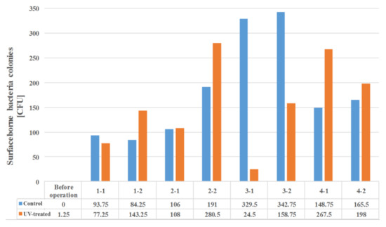 Based on the surface microbial contamination data of the Control and UV-treated samples, we confirmed the correlation between ultraviolet water treatment and surface microorganisms by performing a t-test. In the case of bacteria, the average contamination in Control samples was 182.7, and the average contamination in UV-treated cases was 157.2. Control cases displayed 25.5 times the contamination of UV-treated samples, although this was not statistically significant (p-value = 0.602). However, in the case of fungi, the average contamination in Control cases was 237.9, and the average contamination in UV-treated cases was 81.7. Control cases displayed 156.2 times the contamination of UV-treated samples, and this was statistically significant (p-value = 0.033). This indicates that the degree of surface microbial contamination due to water quality improvement is more sensitive in fungi when compared to bacteria.