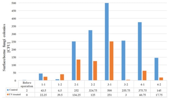 Airborne microbes showed better air quality improvement in this study when compared to the results of Sung et al. [19]. Surface-borne microbes also showed a more pronounced improvement when compared to the results of Sung et al. [19].