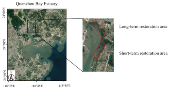 The Quanzhou Bay Estuary (24°51′–24°58′ N and 118°37′–118°43′ E) is at the mouth of the Luoyang River and is a semi-enclosed shallow estuarine bay [45,46] (Figure 1). In October 2003, a provincial-level nature reserve that covered a total area of 7039.56 hm2 was established in the Quanzhou Bay estuary wetland mainly to protect the mangrove ecosystem, wetland waterfowl, and the habitat. The estuary has a southern subtropical marine monsoon climate and has an annual average temperature of 20.4 °C, annual precipitation of 1120 mm, and the soil salinity ranges from 3.5‰ to 28.9‰. The average high and low-tide levels are 4.83 and 0.31 m, respectively [46]. The Quanzhou Bay estuary has three native mangrove species, Aegiceras corniculatum, Kandelia candel, and Avicennia marina, which form pure stands that extend over a large area [45]. Aegiceras corniculatum and Kandelia candel are widely used in coastal wetland restoration in this area.