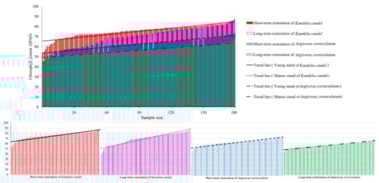 We analyzed and compared the data for mangrove leaves from four different conditions. The SPAD values for the chlorophyll content of the short-term restoration of Kandelia candel were mainly between 54 and 88 SPAD, and were between 70 and 85 SPAD for 81% of the samples. The chlorophyll content of the long-term restoration of Kandelia candel were relatively uniformly distributed between 39 and 87 SPAD, with the distribution being relatively uniform. The chlorophyll content of the short-term restoration of Aegiceras corniculatum were mainly distributed between 45 and 74 SPAD, and 83% of the values were between 55 and 70 SPAD. The chlorophyll content of the long-term restoration of Aegiceras corniculatum were mainly between 43 and 68 SPAD, and 91% of the values were between 50 and 65 SPAD. From the average and trend line of the chlorophyll content (see Table 2 and Figure 4), we conclude that the chlorophyll content decreases in the order of the short-term restoration of: Kandelia candel > long-term restoration of Kandelia candel > short-term restoration of Aegiceras corniculatum > long-term restoration of Aegiceras corniculatum. The chlorophyll contents of the short-term restoration mangroves were higher than those of the long-term restoration mangroves for both species.