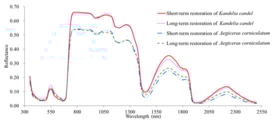 The original spectral reflectances of the mangrove leaves ranged from 350 to 2500 nm, as shown in Figure 5. The spectral reflectance curves of the different mangrove leaves coincided in the red light region (620–760 nm). The spectral reflectance curves of the mangrove leaves, both long-term and short-term restorations, show that the reflectance tended to be higher from Kandelia candel than Aegiceras corniculatum. This was particularly noticeable for the wavelengths between 760 and 1300 nm, where the reflectance of Kandelia candel was higher than 0.55 and that of Aegiceras corniculatum was lower than 0.55. The spectral reflectance of Kandelia candel is higher than that of Aegiceras corniculatum. The leaf spectral reflectance curves of long-term restoration and short-term restorations of Kandelia candel basically coincided, and there was no obvious difference between the spectral reflectances of the leaves from short-term and long-term restoration of the same species of mangrove. For Kandelia candel, the spectral reflectance from the short-term restoration mangrove was higher than that from the long-term restoration mangrove in most wavelength band regions, while for Aegiceras corniculatum, the spectral reflectance from the long-term restoration mangrove was higher than that from the short-term restoration mangrove in most wavelength band regions.