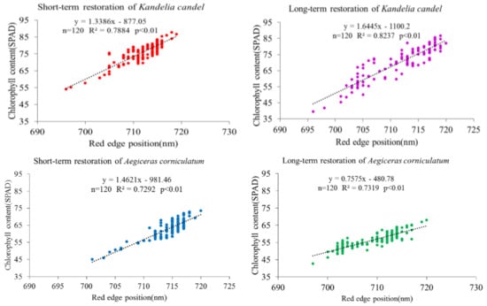 At the red edge, the reflectivity rises sharply because of the intense absorption of vegetation in the red band and multiple scattering of near-infrared radiation within the leaf, resulting in a steep and almost-straight beveled edge. The edge is generally between 660 and 770 nm [53,54,55]. We investigated the relationship between the location of the red edge and the SPAD value from the spectral measurements and the SPAD values of the mangrove leaves. The chlorophyll content was predicted from a regression equation established between the red-edge position and the SPAD value. The accuracy of the red-edge position model worsened in the order of: long-term restoration of Kandelia candel > short-term restoration of Kandelia candel > long-term restoration of Aegiceras corniculatum > short-term restoration of Aegiceras corniculatum (Figure 6).